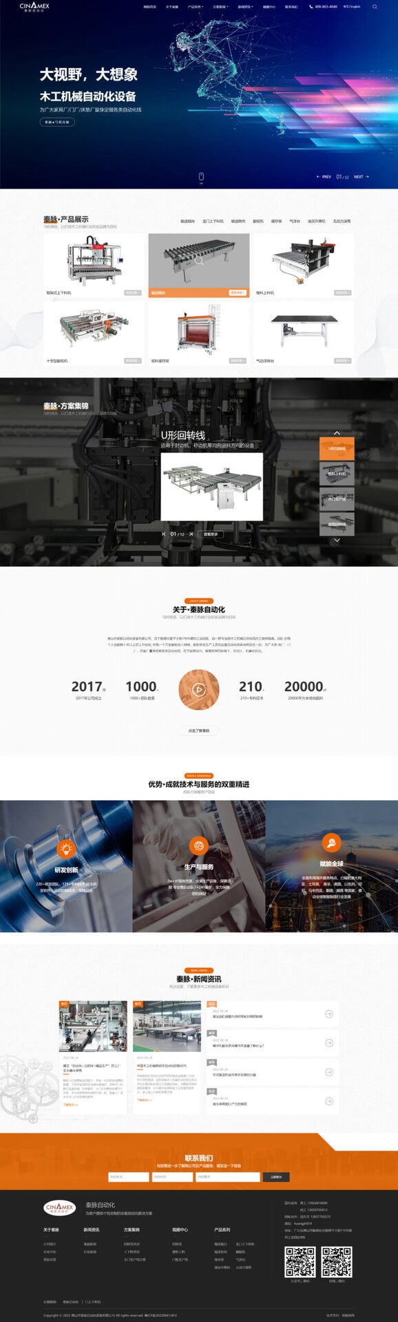 视觉风格上,网站采用简洁、工业化、专业感强的布局 — 配以工厂设备实拍、设备线条感强、机器与流水线场景图,整体格调偏理性与功能型,突出“自动化 /工业制造 /批量生产 /定制输出”的专业印象。导航清晰、分类明确,适合 B2B 采购、工程合作、系统集成商等目标访客快速浏览与筛选。