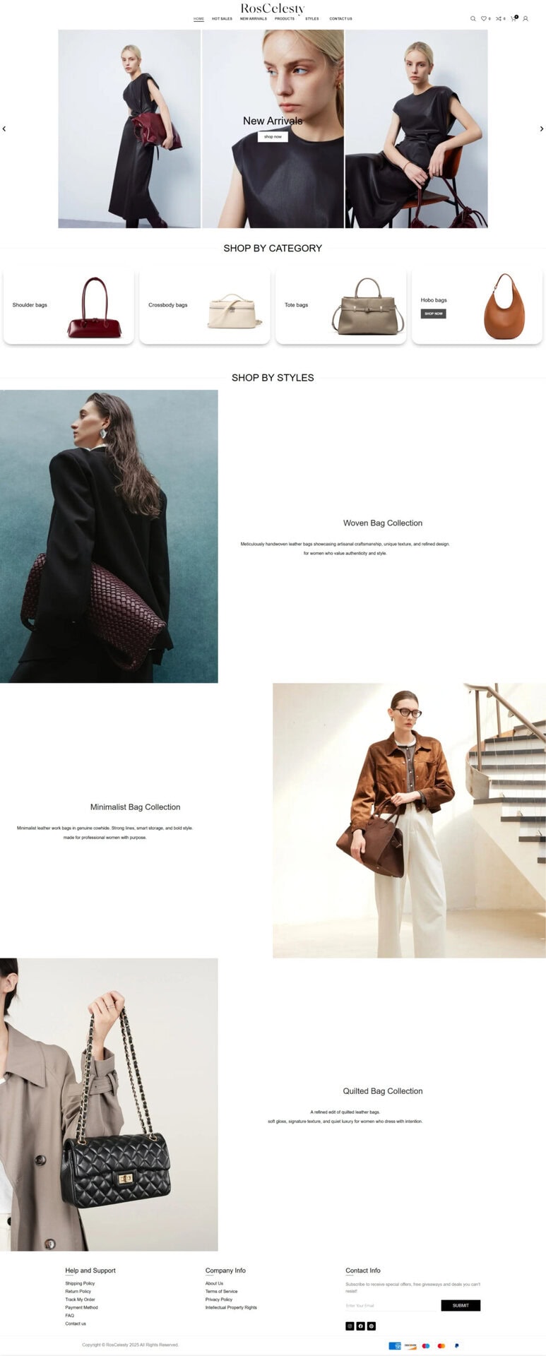 鉴于其产品种类(手提包、手袋、背包、钱包等)以及面向终端消费者的销售模式,RosCelesty 的官网定位更偏向 B2C/零售电商 — 面向普通消费者提供时尚包袋产品。根据官网 “支付方式” 页面,其支持信用卡和 PayPal 等国际主流支付方式,提示该站点面向国际买家或海外消费者。