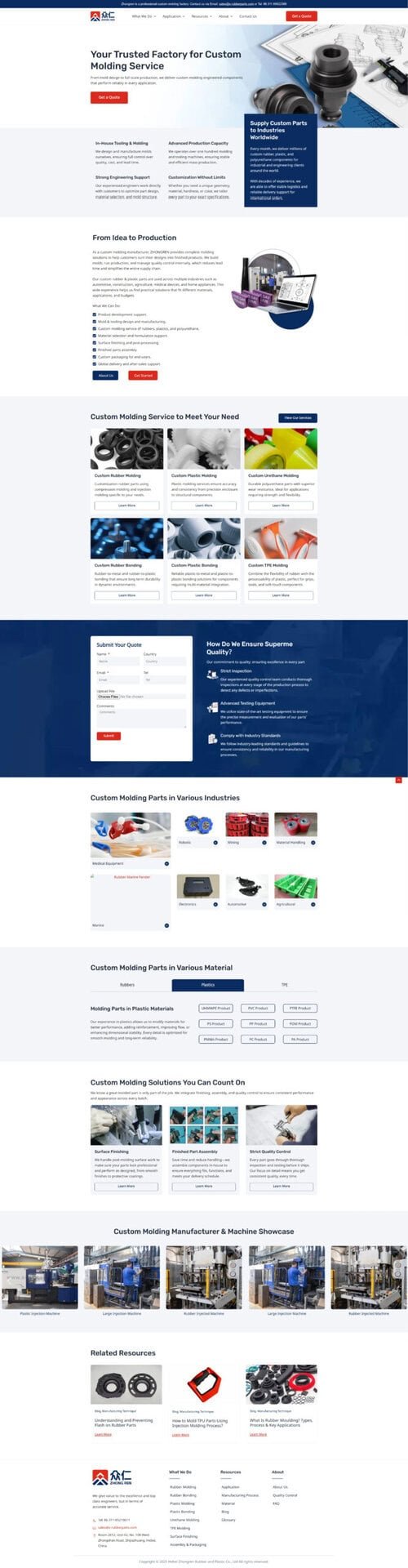 Zhongren 是一家专业从事橡胶与塑胶零部件生产与出口的企业,其产品涵盖广泛 —— 包括橡胶密封件、减震隔振件、橡胶垫圈 (gaskets, seals, O‑rings)、防震/防冲击零件 (bumpers, bushings, vibration mounts)、以及用于机械、工业设备、汽车、电子设备、防水防尘系统等场景的定制橡胶部件。其目标市场包括工业制造商、机械/设备厂商、汽车及零部件供应链、电子设备制造商等。客户希望通过官网展示其完整产品线、生产与定制能力、材料与成型技术、以及出口与服务能力,以增强国际买家/渠道商对其专业性和供应能力的信任,从而扩大出口与国际合作。