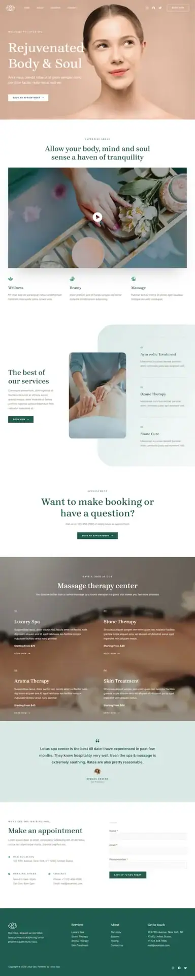 - 产品展示: 使用Astra主题的定制功能,突出莲花水疗的产品和服务,包括水疗护理、按摩疗法等,以吸引潜在客户的注意。