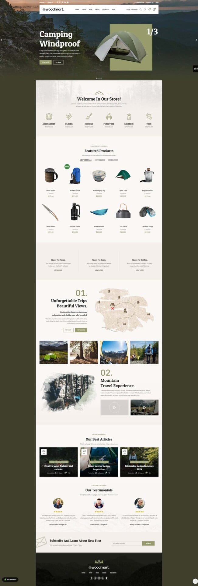 Woodmart主题是一个功能强大且灵活的WordPress主题,专为电子商务网站设计。它提供了许多定制选项和现代设计元素,适用于各种行业,包括露营和户外用品。通过选择适合露营主题的风格和布局,您可以确保网站与目标受众的喜好和需求相匹配。