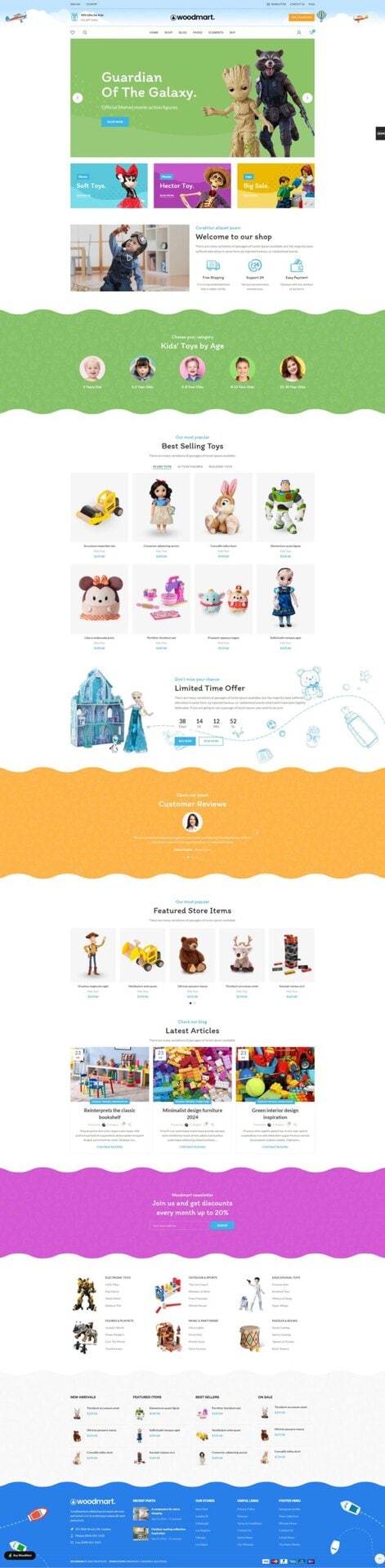 Woodmart主题是一个专为电子商务网站设计的主题。它提供多种布局和定制选项,非常适合用来建立玩具商城网站。这个主题具有响应式设计,可以很好地适应不同设备的屏幕大小,无论是在电脑上浏览还是在手机上购物,用户都能得到良好的体验。